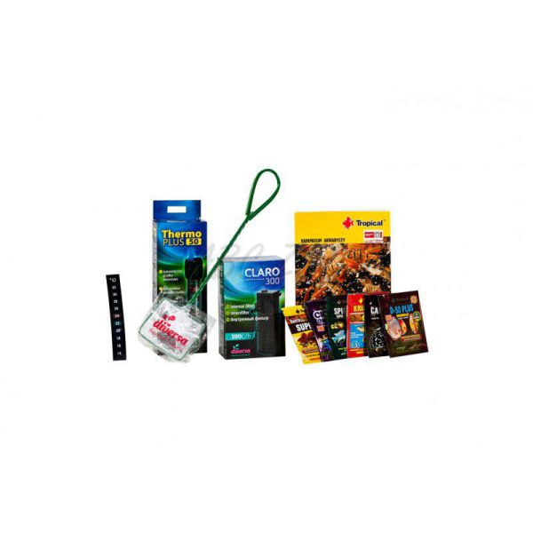Set s akvarijem s ravnim prednjim staklom, širinom 40 cm i volumenom 25 l, isporučuje se s rasvjetom, filtrom, grijačem, mrežicom i uzorcima hrane. Više detalja