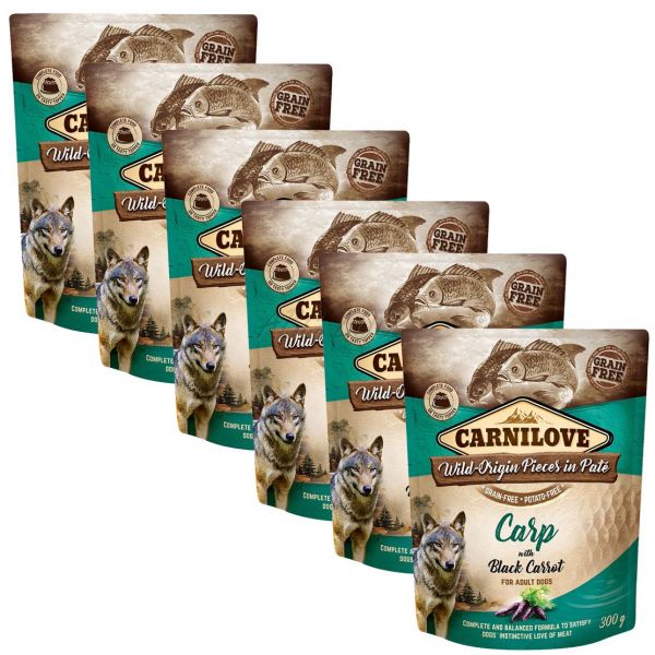 Carnilove je vlažno krmivo u vrećici za odrasle pse, s šaranom i crnom mrkvom, bez žitarica ili krumpira.
