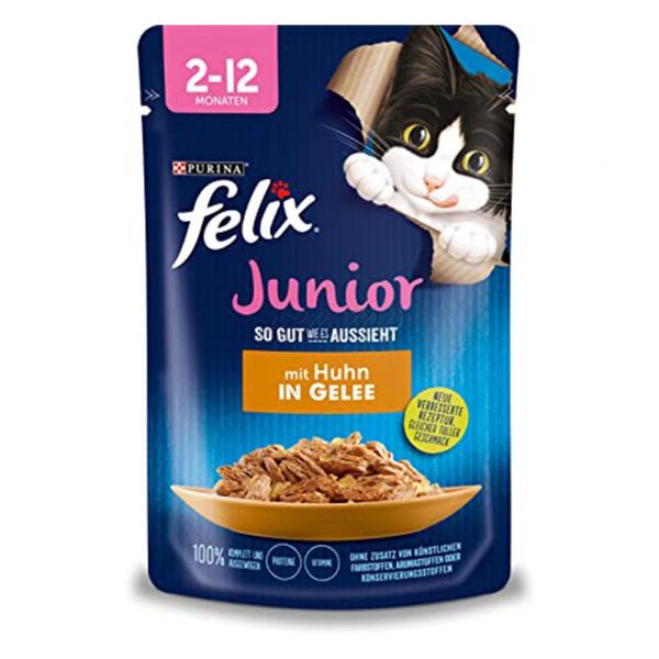 FELIX® Fantastic Junior je linija neodoljivih hrane koja izgleda, miriše i ima okus tako ukusno kao jelo koje biste sami skuhali! Svaka receptura, napravljena od kvalitetnih sastojaka, sadrži sočne komade u želeu, kako bi se vaše mačiće moglo dobro ugristi u ukusnu hranu! Mačići trebaju posebnu prehranu tijekom prve godine svog života. Stoga je svaka receptura posebno dizajnirana kako bi pokrila 100 % dnevnih potreba vašeg mačića. Puna je proteina i vitamina koji pomažu u rastu jakih mišića, kostiju i zuba za sretnu i nestašnu odraslu mačku! Pogledajte upute za hranjenje. To nije sve! FELIX Fantastic Junior dostupan je u cijelom nizu ukusnih receptura u sočnom želeu, kako bi svaki dan zadovoljio ljubav vašeg mačića prema raznolikosti. Stvarno imaju tako dobar okus kao što izgledaju! FELIX je jednostavno neodoljiv!