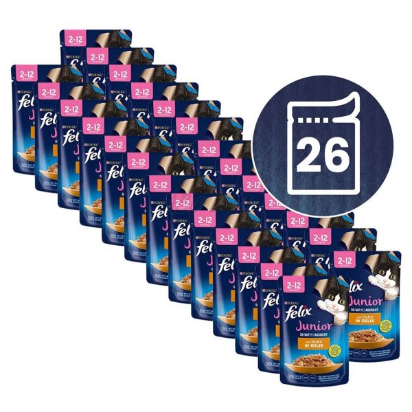 FELIX® Fantastic Junior je linija neodoljivih hrane koja izgleda, miriše i ima okus tako ukusno kao jelo koje biste sami skuhali! Svaka receptura, napravljena od kvalitetnih sastojaka, sadrži nježne komadiće u želeu, kako bi se vaše mačiće moglo dobro ugristi u ukusnu hranu! Mačići trebaju posebnu prehranu tijekom prve godine svog života. Stoga je svaka receptura posebno dizajnirana kako bi pokrila 100 % dnevnih potreba vašeg mačića. Puna je proteina i vitamina koji pomažu u rastu jakih mišića, kostiju i zuba za sretnu i nestašnu odraslu mačku! Pogledajte upute za hranjenje. To nije sve! FELIX Fantastic Junior dostupan je u cijelom nizu ukusnih receptura u sočnom želeu, kako bi svaki dan zadovoljio ljubav vašeg mačića prema raznolikosti. Stvarno imaju tako dobar okus kao što izgledaju! FELIX je jednostavno neodoljiv!