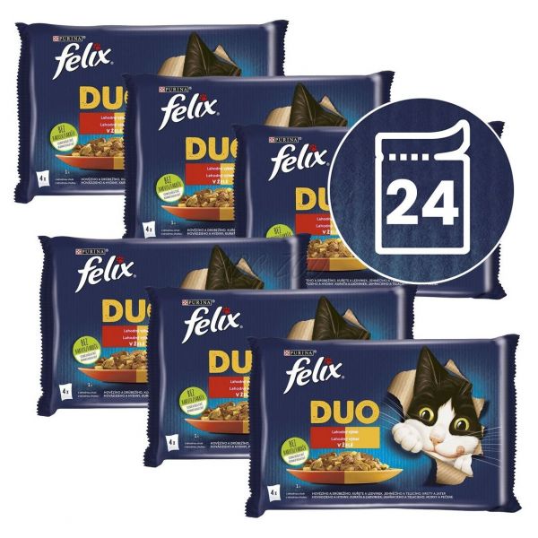 FELIX® Duo je niz neodoljivih hrane koje izgledaju, mirišu i imaju ukus tako ukusno kao jelo koje biste sami skuhali! Svaka receptura, napravljena od kvalitetnih sastojaka, sadrži sočne komade koji kombiniraju dva neodoljiva okusa u želeu. Tako vaša mačka može uživati u dva omiljena okusa odjednom! Ujedno su izvor omega-6 masnih kiselina i imaju pravu kombinaciju vitamina kako bi vaša mačka bila puna energije i spremna za nestašluke! Prepune su dobrih stvari i zadovoljavaju 100 % dnevnih potreba vaše mačke kada se daju prema uputama za hranjenje. To nije sve! FELIX Duo je dostupan u cijelom nizu neodoljivih receptura u ukusnom želeu, kako bi svaki dan zadovoljio ljubav vaše mačke prema raznolikosti. Stvarno dvostruko izvrstan! FELIX je jednostavno neodoljiv!