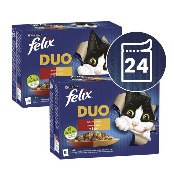 FELIX® Duo je niz neodoljivih hrane koja izgleda, miriše i ima okus tako ukusno kao jelo koje biste sami skuhali! Svaka receptura, napravljena od kvalitetnih sastojaka, sadrži sočne komade koji kombiniraju dva neodoljiva okusa u želeu. Tako vaša mačka može uživati u dva omiljena okusa odjednom! Ujedno su izvor omega-6 masnih kiselina i imaju pravu kombinaciju vitamina kako bi vaša mačka bila puna energije i spremna za nestašluke! Prepuni su dobrih stvari i zadovoljavaju 100 % dnevnih potreba vaše mačke kada se daju prema uputama za hranjenje. To nije sve! FELIX Duo dostupan je u cijelom nizu neodoljivih receptura u ukusnom želeu, kako bi svaki dan zadovoljio ljubav vaše mačke prema raznolikosti. Zaista dvostruko izvrstan! FELIX je jednostavno neodoljiv!