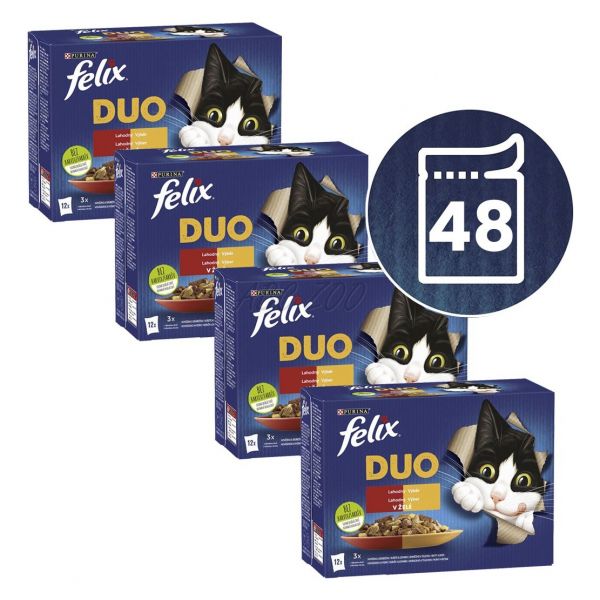 FELIX® Duo je niz neodoljivih hrane koja izgleda, miriše i ima ukus tako ukusno kao jelo koje biste sami skuhali! Svaka receptura, napravljena od kvalitetnih sastojaka, sadrži sočne komade koji kombiniraju dva neodoljiva okusa u želeu. Tako vaša mačka može uživati u dva omiljena okusa odjednom! Ujedno su izvor omega-6 masnih kiselina i imaju pravu kombinaciju vitamina kako bi vaša mačka bila puna energije i spremna za nestašluke! Puni su dobrih stvari i zadovoljavaju 100 % dnevnih potreba vaše mačke kada se daju prema uputama za hranjenje. To nije sve! FELIX Duo je dostupan u cijelom nizu neodoljivih receptura u ukusnom želeu, kako bi svaki dan zadovoljio ljubav vaše mačke prema raznolikosti. Zaista dvostruko izvrstan! FELIX je jednostavno neodoljiv!