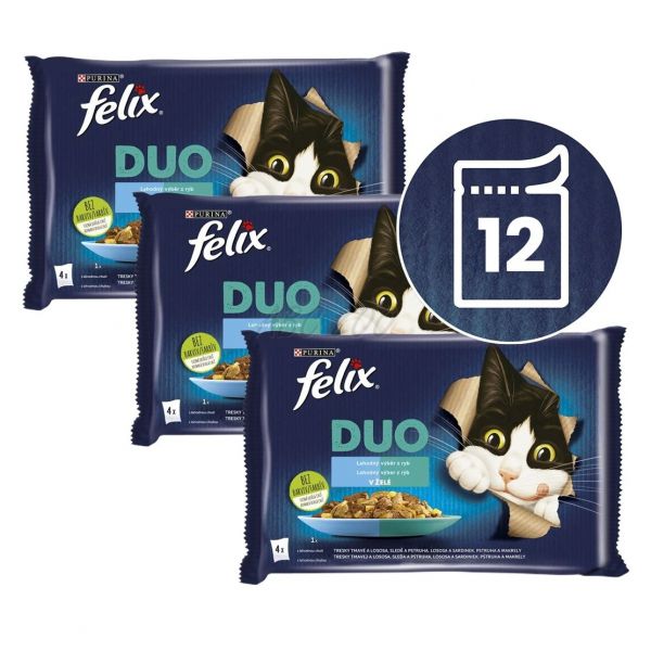 Kapsice za odrasle mačke Felix duo s delikatnim ribama u želeu - tamna bakalara, losos, haringa, pastrva, sardine i skuša.