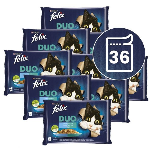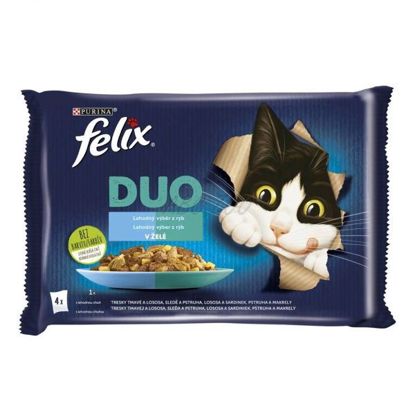 Kapsice za odrasle mačke Felix duo s delikatnim ribama u želeu - tamna bakalara, losos, haringa, pastrva, sardine i skuša.